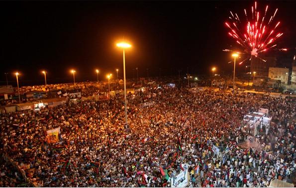 当地时间2011年8月21日,上万利比亚人在港口城市班加西庆祝利比亚反对派武装控制的黎波里。(凤凰网)