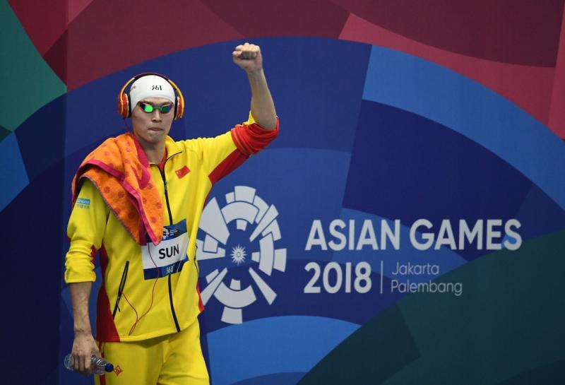 8月19日,在第18届亚运会男子200米自由泳决赛中,中国选手孙杨以1分45秒43的成绩夺冠。这是孙杨在赛前入场的镜头,霸气十足。