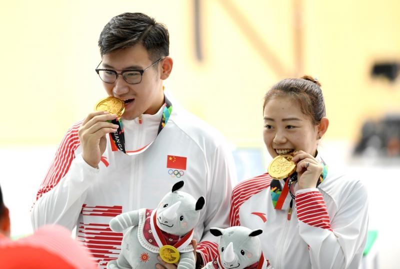8月19日,在第18届亚运会10米气手枪混合团体赛决赛中,中国选手纪晓晶、吴嘉宇以473.2环的成绩夺冠。纪晓晶(右)、吴嘉宇正在向大家展示自己的金牌。