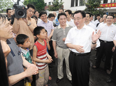 5月7日至11日,中共中央政治局常委、中央纪委书记贺国强先后到湖南省株洲、衡阳、岳阳、湘潭、长沙等地进行调研。图为5月7日贺国强在衡阳市衡山县福田铺乡白云村与村民交谈。(马占成摄)