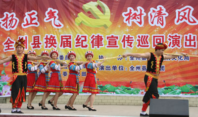为营造风清气正的换届环境,广西壮族自治区全州县将中央纪委、中央组织部提出的“5个严整、17个不准和5个一律”等内容融入文艺节目中,编排成群众喜闻乐见的彩调、小品、快板等,在全县18个乡镇巡回演出,受到广大党员干部和群众的欢迎。图为4月26日该县组织的换届纪律宣传巡回演出场景。(唐宁远 蒋胜元摄)