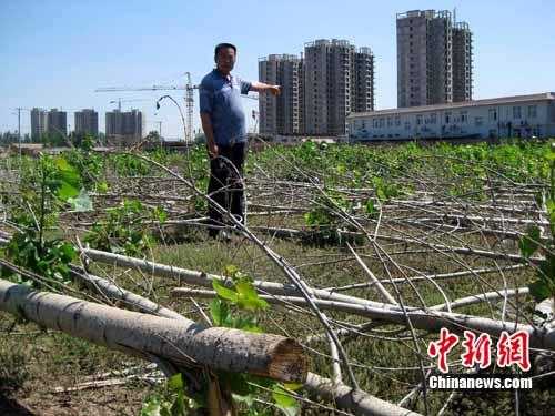 中新网廊坊6月9日电(宋敏涛)“一夜之间近800棵树被人全部砍倒,随后耕地又被开发商强行圈起围挡,政府发的小红本(农村集体土地承包经营权证书)还有什么用?”河北省霸州市牛业庄村村民近日向中新网记者反映称,该村40余亩耕地被圈占搞旧城改造项目,土地尚未获批情况下已举办项目奠基仪式。