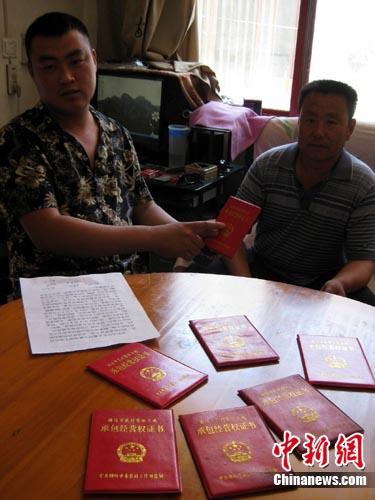 牛业庄村民拿着农村集体土地承包经营权证书,质疑耕地被像香河一样“包装”。宋敏涛 摄