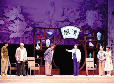 作为郑州市向建党90周年献礼的重点剧目,郑州市纪委、市委宣传部、河南省老艺术家协会、市文广新局共同打造的大型现代原创豫剧《清风茶社》,正是以“清风茶社”为基本素材,依托“清风茶社”唱清风,讲述了女纪检干部章洁在情与法面前坚持党性原则、不徇私情的动人故事,生动再现了郑州市在廉政教育载体方面的创新及成效。图为演出剧照。(宋方 摄影报道)