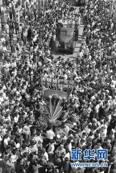 1956年7月,长春第一汽车制造厂生产出中国第一辆解放牌汽车,从此结束了中国不能生产汽车的历史。这是第一批国产解放牌载重汽车排成长列开出长春第一汽车制造厂的时候,全厂职工夹道欢呼。新华社发(资料照片)