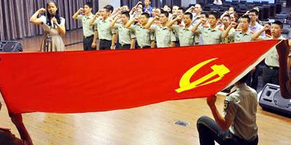 6月28日,为迎接建党90周年,福州边防官兵和福州市第四十中学的60余名党员教师开展角色互换体验活动。教师们身着迷彩服亲身体验边防战士执勤、站岗等日常工作。教师们也带官兵回到学生时代,齐聚课堂学习党史、党章,回顾党的光辉历程和革命先烈的英勇事迹。图为党员官兵和教师们一起重温入党宣誓。(孙旭晖 摄)
