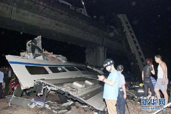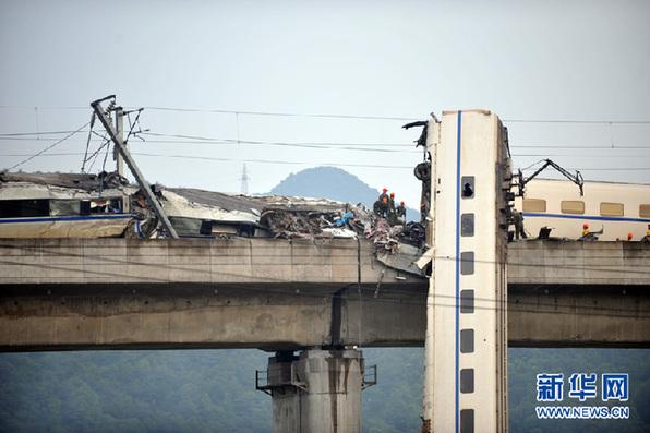 7月24日,救援人员和施工人员在清理事故现场。记者从浙江省政府应急办最新获悉,截至24日凌晨四点,两列动车温州境内追尾事故已造成32人遇难,受伤人数上升至191名,目前救援人员和施工人员正在清理事故现场。新华社记者 鞠焕宗 摄