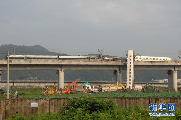 7月24日,救援人员和施工人员在清理事故现场。新华社记者 鞠焕宗 摄