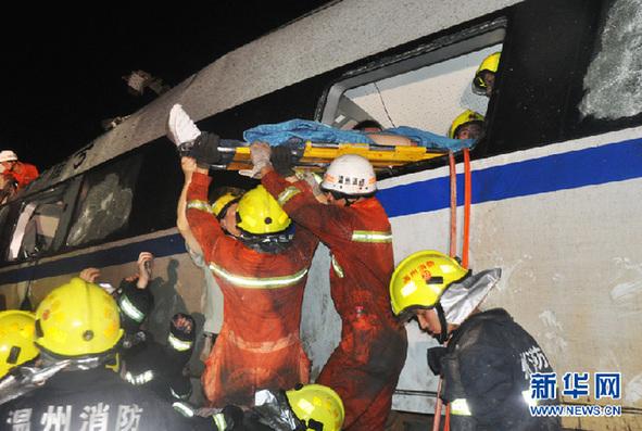 7月23日23时17分许,在温州动车追尾事故现场,救援人员把一名伤者从车厢窗口抬出。新华社发(余根铃 摄)