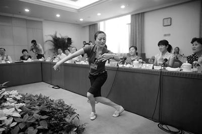 "随机"起舞 昨日,市十一次党代会朝阳区分团会议结束后,朝阳区文化馆项目负责人罗晓英应其他代表要求,现场随着手机音乐表演了一段舞蹈。新京报记者 赵亢 摄影报道