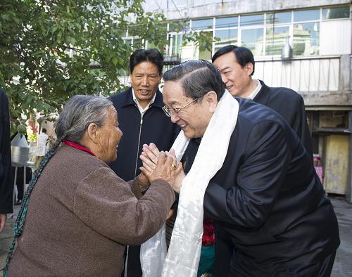 8月1日至6日,中共中央政治局常委、全国政协主席俞正声在西藏调研。这是8月3日,俞正声在拉萨鲁固社区问候一名藏族老阿妈。新华社记者 王晔 摄