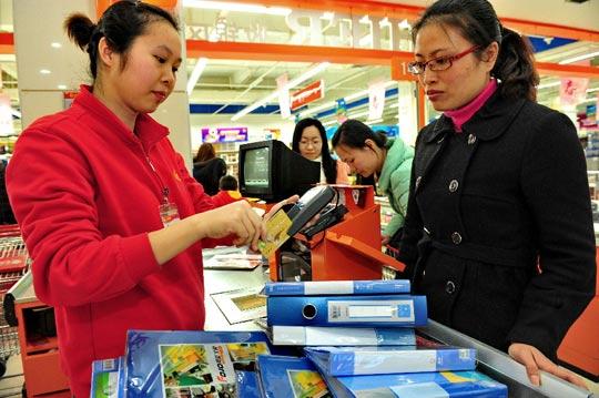 图为3月10日,闽侯县纪检干部(右)在一家商场用“公务卡”购买办公用品。