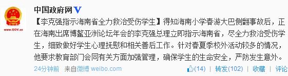 据国务院办公厅政府信息公开办公室微博消息,得知海南小学春游大巴侧翻事故后,正在海南出席博鳌亚洲论坛年会的李克强总理立即指示海南省,尽全力救治受伤学生,细致做好学生心理抚慰和相关善后工作。针对春夏季校外活动较多的情况,他要求教育部门会同有关方面加强管理,确保学生的生命安全,严防发生意外。