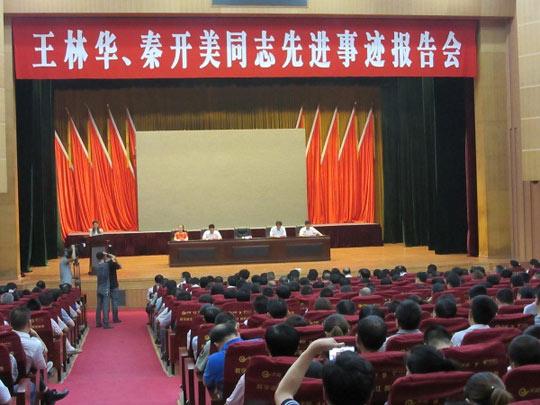 16日下午,王林华、秦开美先进事迹报告会在人民会堂举行。
