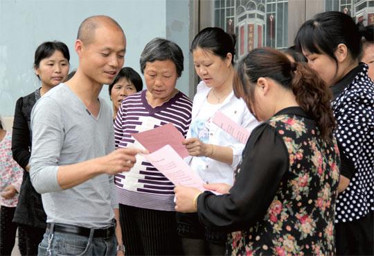 图为该区纪委干部向群众发放“四风”问题调查表。章艳 张治炉 摄
