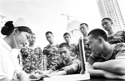 “八一”建军节前,重庆市永川区卧龙医院爱心医疗小分队走进驻该区消防支队特勤中队营区开展义诊服务。医务人员现场为官兵进行体检,回答官兵提出的各种健康问题,并向官兵讲解有关夏季传染性疾病防控知识,以实际行动共叙军民鱼水情。上图为医务人员为官兵测量血压。下图为医务人员为官兵讲解心电图检查结果。陈仕川 摄