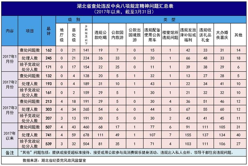 为掌握全省贯彻落实中央八项规定精神情况,湖北省纪委在全省市州、直管市、神农架林区和省纪委派驻纪检组、省直机关纪工委建立了落实中央八项规定精神情况月报制度。2017年以来,截至3月31日,全省查处违反中央八项规定精神问题情况如下: