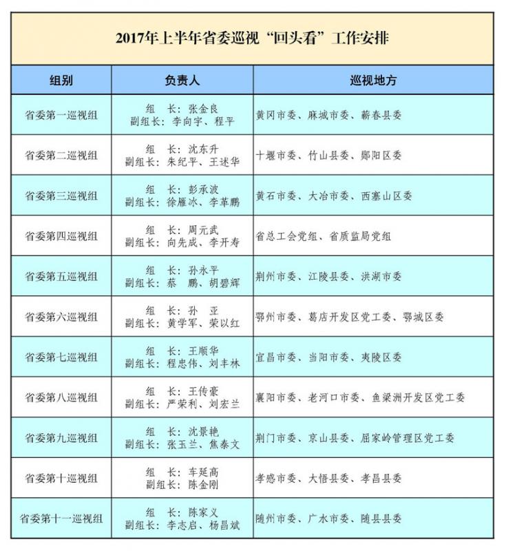 4月20日,湖北省启动2017年上半年巡视“回头看”工作,计划于今年5月底前完成对黄冈市等32个地方和省直单位党委(党组)的巡视“回头看”。湖北省委常委、省纪委书记、省委巡视工作领导小组组长王立山,省委常委、组织部部长、省委巡视工作领导小组副组长于绍良对巡视“回头看”工作进行动员部署。