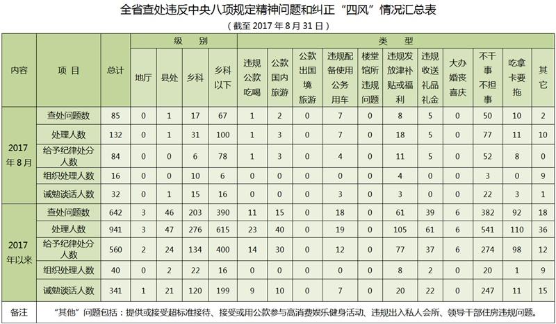 根据海南省党风廉政建设责任制领导小组办公室对19个市县、94个省直单位、14家省属国有企业和9所高校查处违反中央八项规定精神问题和纠正“四风”情况进行的统计,2017年8月份,全省共查处相关违纪违规问题85起,处理132人,给予纪律处分84人,组织处理16人,诫勉谈话32人。具体情况如下: