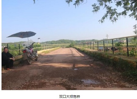 双口大坝位于双板桥水库双建支渠的双口村,老石拱桥始建于1968年,是通往周边鸡笼镇和衡阳县的必经之路,客流量大加之年久失修,桥面破损不堪重负,危及车辆人行安全。如果拦河坝蓄水泄洪出现险情,将会直接影响下游双口、先锋、建伟3个村的5000多亩稻田灌溉。群众反映强烈,迫切要求对危桥进行改造。经测算,双口大坝危桥改造项目资金近200万元。