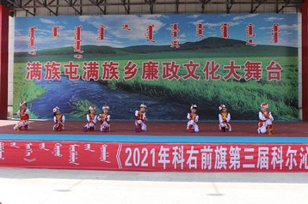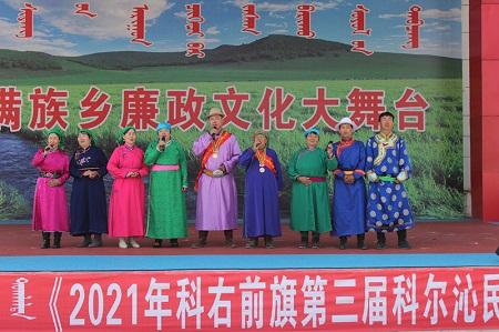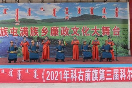 为献礼建党百年,深入推进党风廉政建设和反腐败工作,进一步加强对党员干部的反腐倡廉教育,努力营造良好的政治生态环境,引导广大党员干部强化廉洁自律意识,筑牢拒腐防变的思想防线,满族屯满族乡举办了“清风草原”廉政文艺汇演,用歌声将廉政文化唱进每一名党员干部和牧民群众的心里,用乌力格尔这一蒙古族的曲艺说书形式将廉政文化讲述到每一位群众的心里。