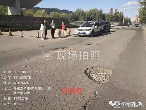 接诉即办,勇担当。我区接到市民求助工单,反映师范大学青年政治学院大门前道路破损严重,路面坑洼不平,希望有关部门尽快处理。接单后,有关部门第一时间与诉求人取得了联系,并及时到达现场了解情况。经核实,青年政治学院门前路段是生态路与呼武公路的连接段,既不属于生态路也不属于呼武公路,且不在我区农村公路数据库内,鉴于该路段属山路,具有一定的坡度,路面坑洼破损对学生出行及来往车辆带来了不便,并存在严重的道路安全隐患。针对以上问题,经多方协调,对该路段进行了抢修,诉求人对办理结果满意并表示感谢。