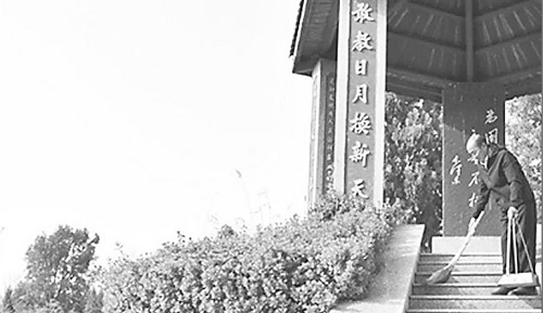 王志杰在纪念碑亭打扫卫生。(资料图片)