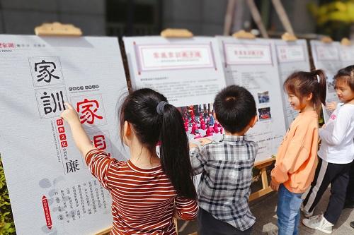 浙江省杭州市临平区星桥第二小学开展“童心扬正气,廉洁传家风”主题板报展,打造“弘家训、树家风”的廉洁文化“星”阵地。图为学生在主题板报展中参观、交流、探讨,接受廉洁家风熏陶。浙江省杭州市临平区纪委监委 林韵 摄