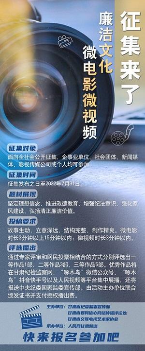 【清廉网】为强化党员干部廉洁自律意识,在全社会营造和弘扬崇尚廉洁、抵制腐败的良好风尚,特举办廉洁文化微电影微视频征集活动。本次活动由甘肃省纪委监委宣传部、省委网信办网络传播评论处、省文联电视艺术家协会联合主办,人民网甘肃频道承办。