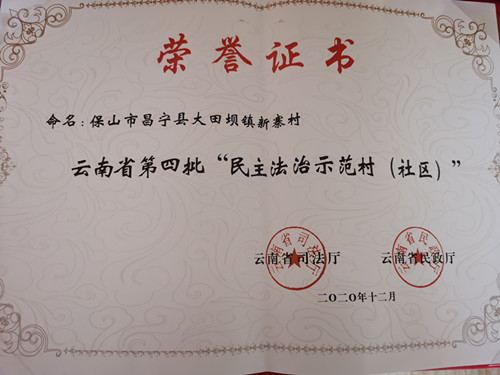 2020年12月新寨村获云南省第四批“民主法治示范村(社区)”