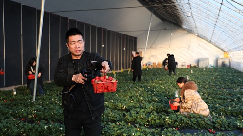 “老铁们,这里是虎林镇耕农村草莓种植基地,看我手中的草莓,果汁饱满、香味浓郁,这个品种采用牛奶发酵浇灌技术,吃起来有牛奶味道,清爽可口甜而不腻!”草莓大棚内,一场吸引5万多名粉丝同时在线的抖音直播正在进行,网红主播绘声绘色介绍草莓品质、价格,以及种植基地的位置和交通线路,市民通过定位导航蜂拥而至,草莓销量迅速攀升。
