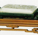 清 碧玉镶白玉墨床 墨床:亦称墨架、墨台。研磨墨时稍事停歇,因墨锭磨墨处湿润,乱放容易玷污他物,故为供临时搁墨锭用的用具。多为玉、瓷所制,通...